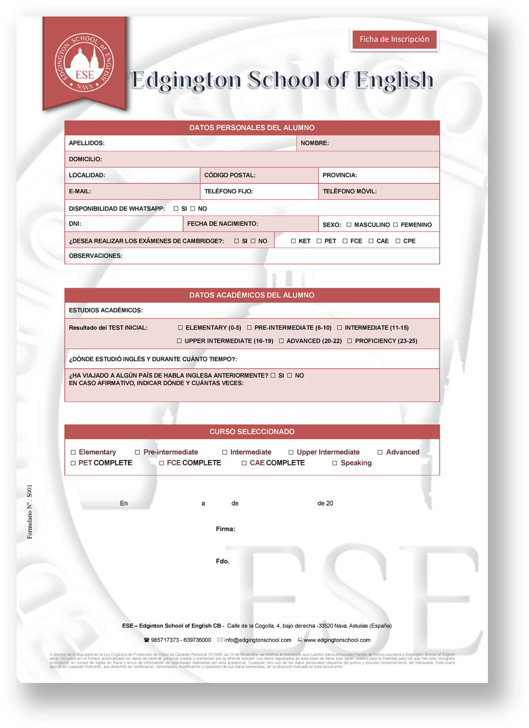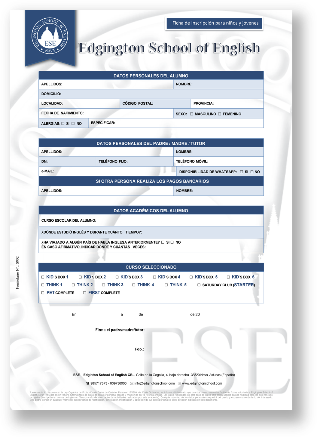 La ficha de inscripción (S002) mas la autorizacion para la recogida del alumno/a por otras personas es necesario cumplimentarlas antes del comienzo de las clases en Septiembre. Por otro lado es necesario rellenar la autorización en el reverso para la reproducción y uso de fotos de los alumnos menores de 14 años. Rellenar el formulario de domiciliacion (B001) es opcional. La domiciliación bancaria es un documento que nos autoriza a realizar los cobros a traves de nuestro banco automáticamente cada mes sin coste adicional para el alumno. Los cargos a cuenta se realizarán el día 5 de cada mes o al siguiente laboral. Si prefiere camiar los cargos a otro día bastará con comunicarnoslo.