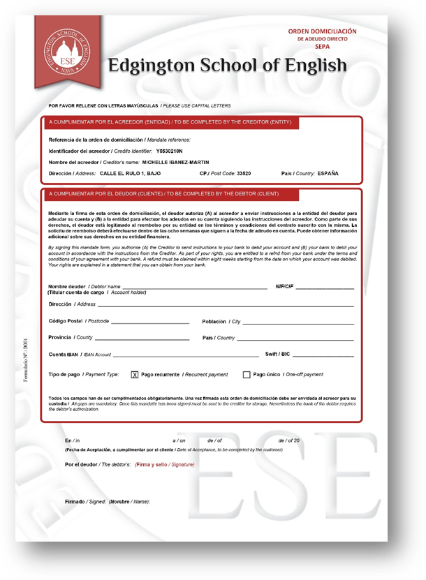Es necesario entregar cumplimentada la ficha de inscripción (S001) antes del comienzo de las clases o el primer dia. Rellenar el formulario (B001) para domiciliar la cuota mensual a traves del banco es opcional. Los pagos mediante este método se realizarán sin coste adicional para el alumno. El cobro mensual a través del banco se realizará el día 5 de cada mes o si es festivo el siguiente día laborable. Si prefiere cambiar el día de cargo nos lo pueden comunicar para realizar el cambio.
